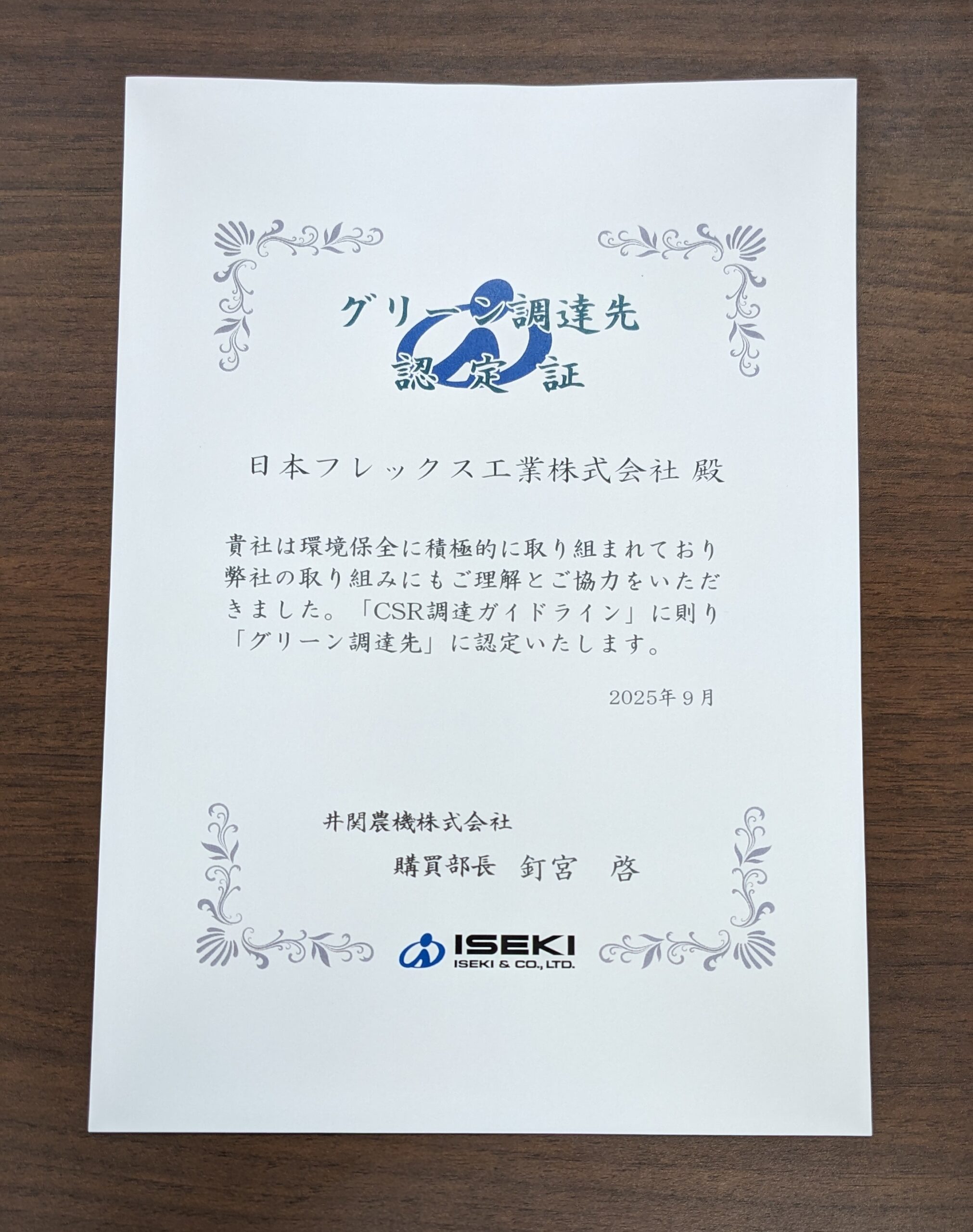 この度、井関農機株式会社様よりグリーン調達先認定証を頂きました。